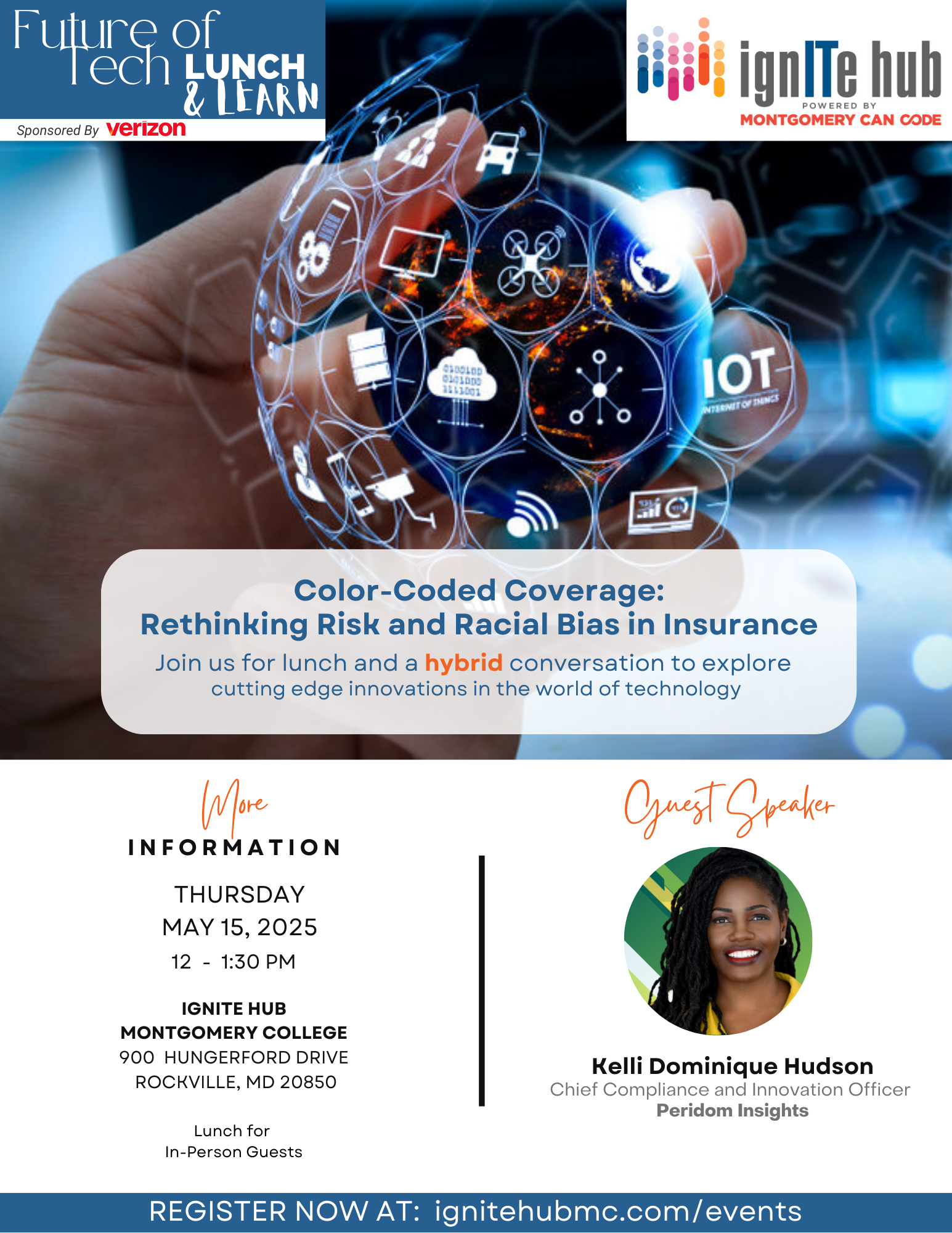 The ignITe Hub hosts a monthly Future of Tech Lunch & Learn Series. Each month, we will have a cutting-edge guest speaker to explore an innovative area in the world of technology. Topics will range from BioTech to Entertainment Technology and beyond. We will learn from notable industry experts about a specific type of technology, how this technology is being used to solve a community problem and what are unique career pathways related to this field. Thank you to Verizon for their generous sponsorship of this series.