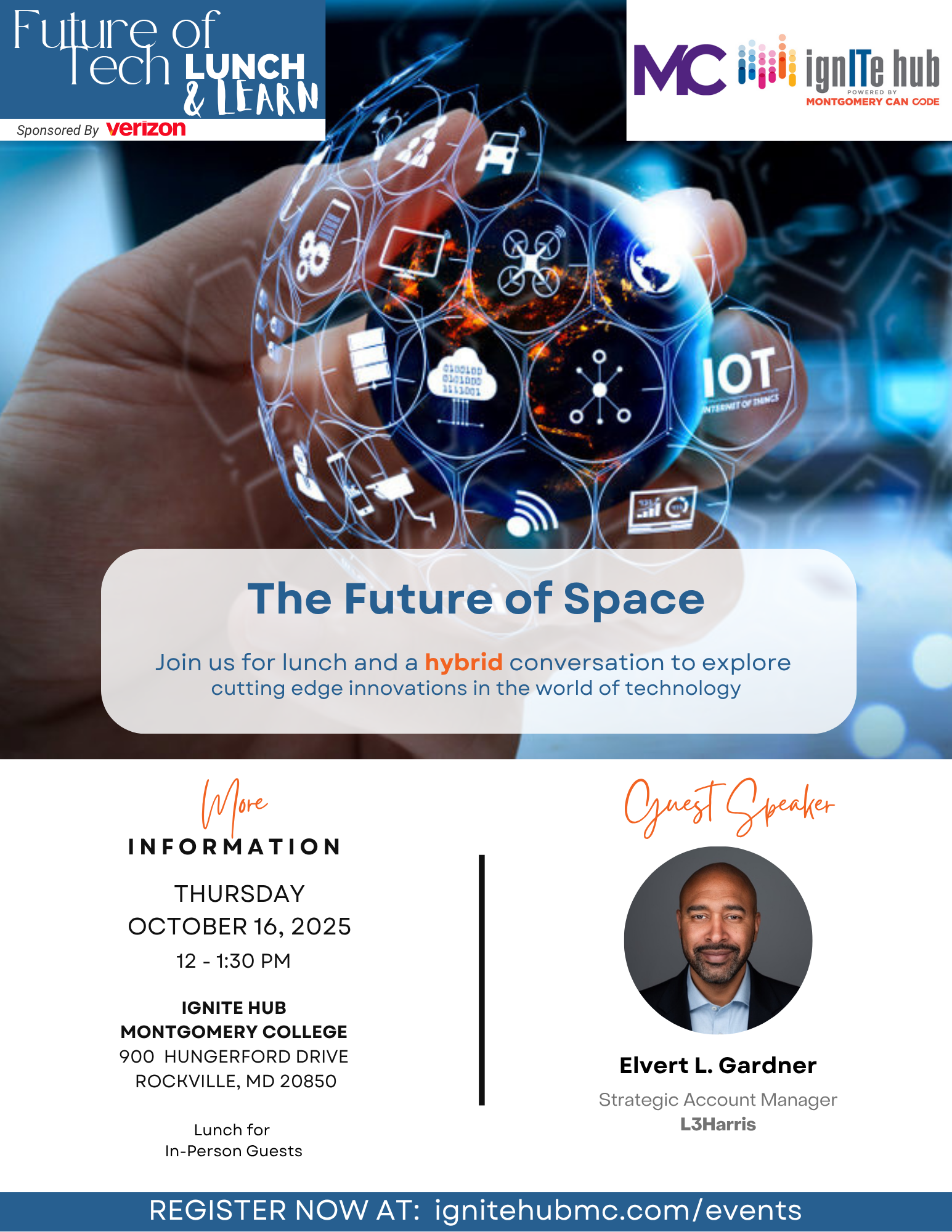The ignITe Hub hosts a monthly Future of Tech Lunch & Learn Series. Each month, we will have a cutting-edge guest speaker to explore an innovative area in the world of technology. Topics will range from BioTech to Entertainment Technology and beyond. We will learn from notable industry experts about a specific type of technology, how this technology is being used to solve a community problem and what are unique career pathways related to this field. Thank you to Verizon for their generous sponsorship of this series.